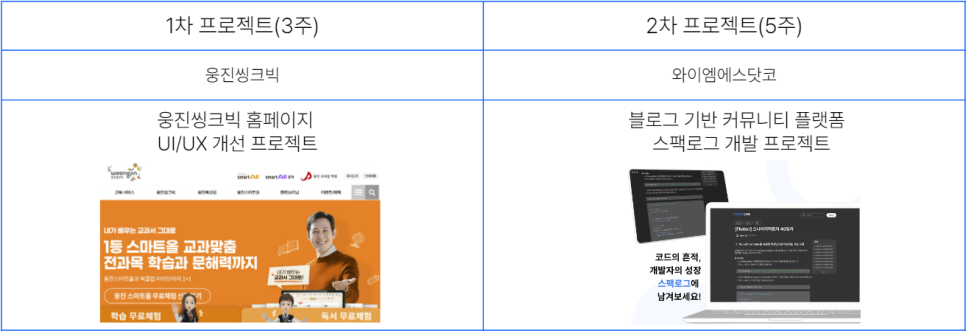 인턴십 기간은 총 8주이며, 1차 프로젝트 3주 진행 후 2차 프로젝트를 5주 동안 진행하게 됩니다.