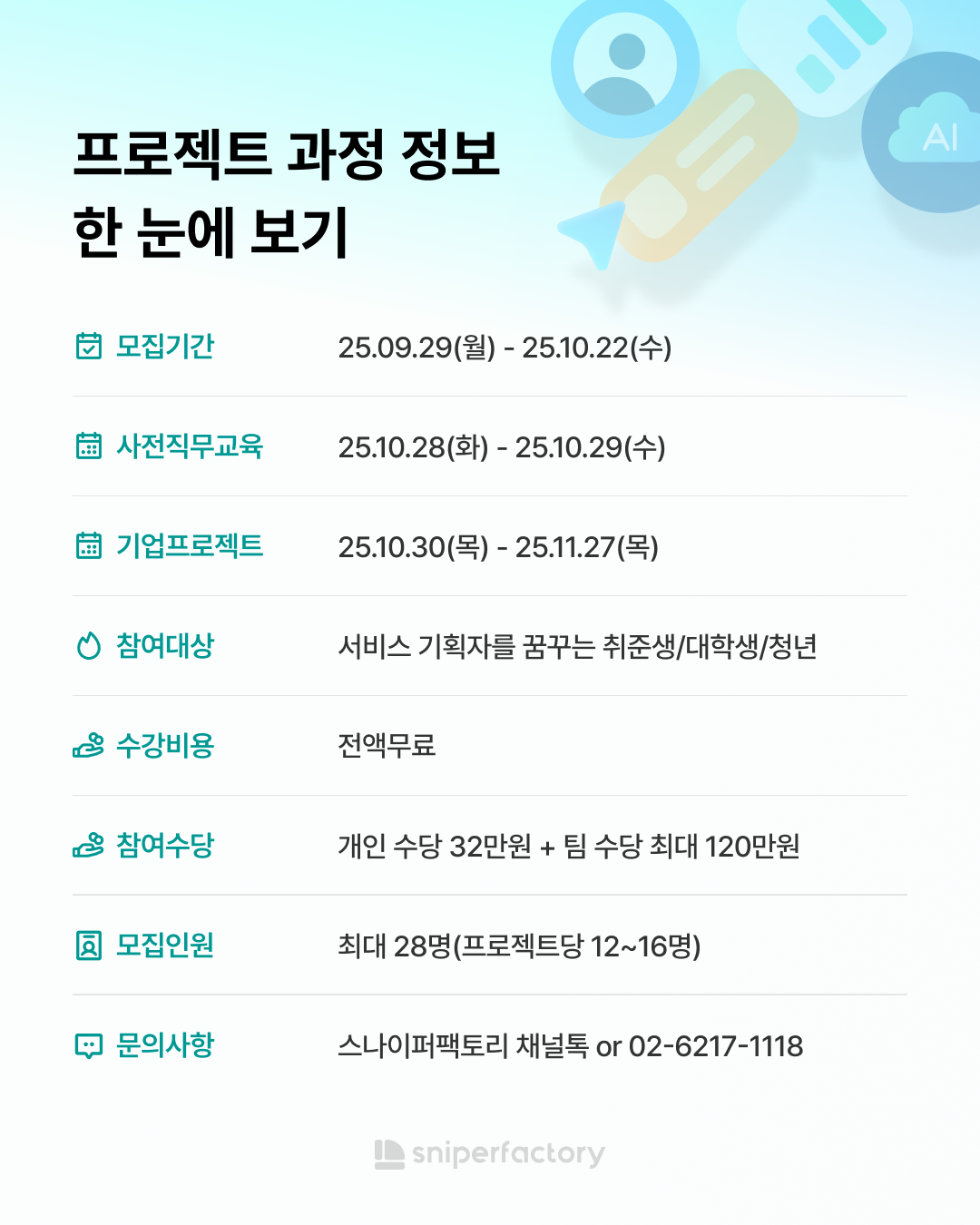 | [스나이퍼팩토리x홈앤쇼핑x바이스벌사] SNS 콘텐츠마케팅 기업 연계 프로젝트 과정 모집(~10/13) (1) | 2025.09.22 |